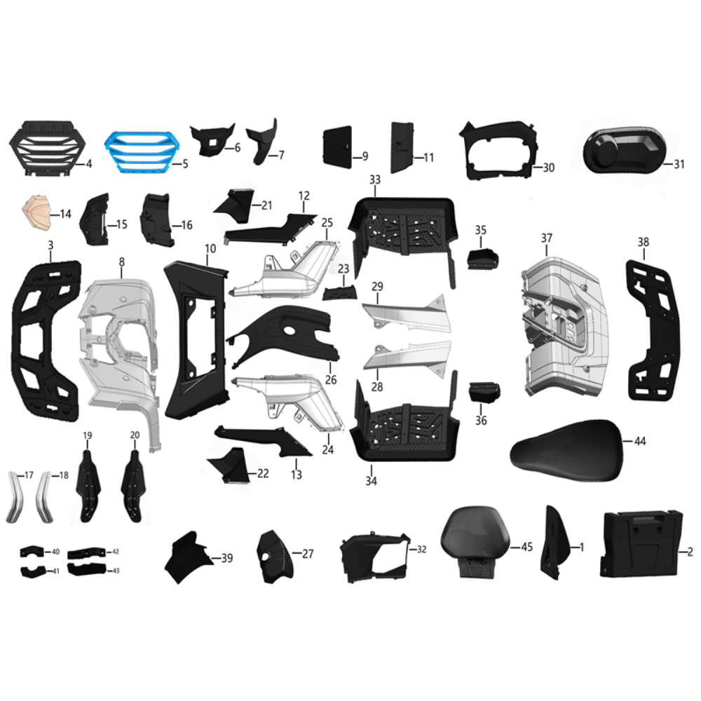 Delovi oklopa (Body) obuhvataju sve plastične i metalne spoljašnje elemente ATV vozila koji štite mehaniku i oblikuju vizuelni izgled. U ponudi su prednji i zadnji poklopci, maske, branici, štitnici ruku, bočni poklopci, oplata rezervoara, zaštite motora, gazišta, nosači, nosači instrumenata, kao i sedišta i nasloni. Svi delovi obezbeđuju zaštitu, funkcionalnost i estetski izgled vozila.