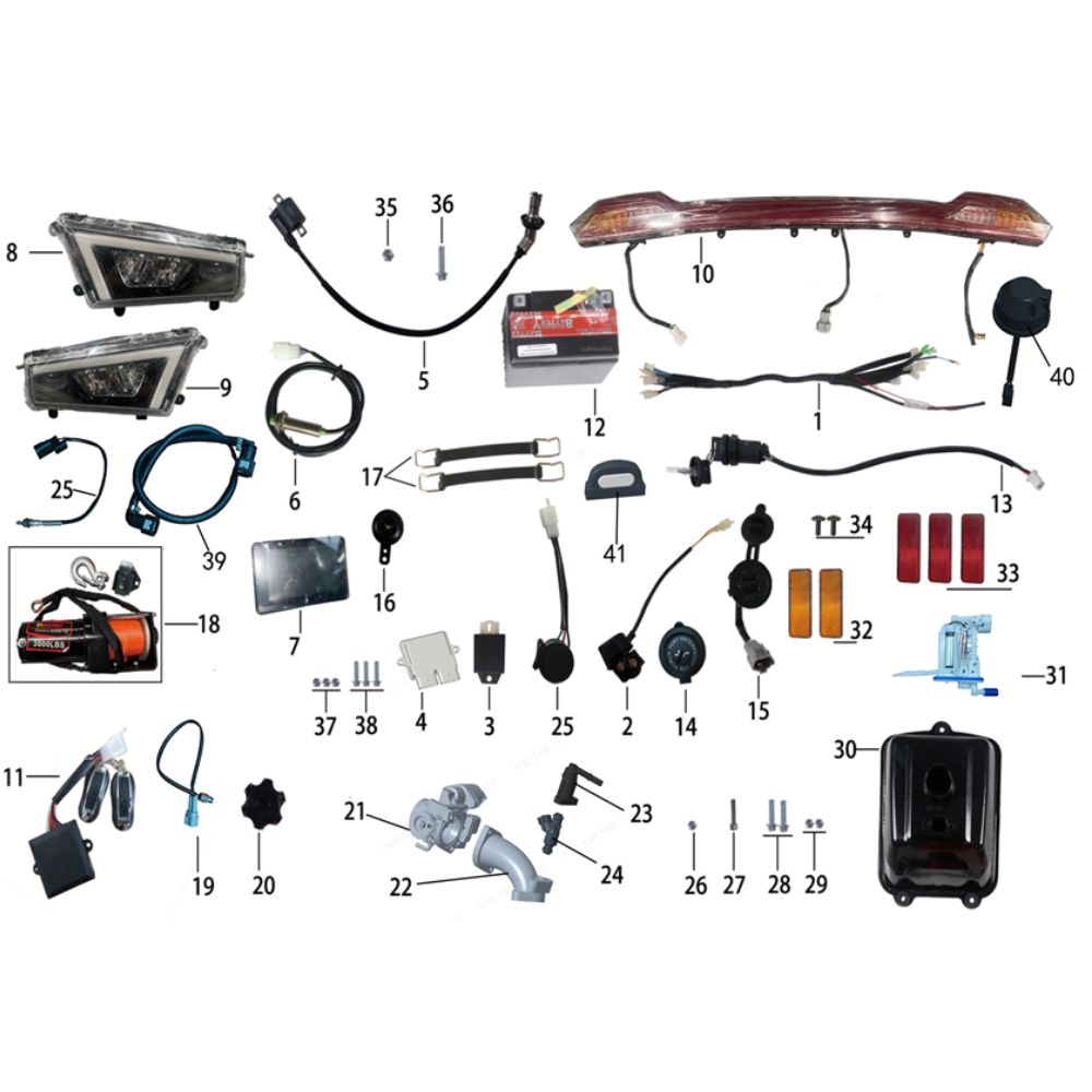 Elektrika obuhvata sve komponente zadužene za napajanje, paljenje, signalizaciju i kontrolu motora i vozila. U ponudi su glavni kablovi, ECU, releji, regulator pritiska, senzori, merači, farovi, svetla za vožnju, alarmi, baterije, električna vitla, USB priključci, pumpa za ulje, reflektori i prateći elementi, koji zajedno obezbeđuju pouzdan rad, sigurnost i efikasnu kontrolu svih električnih sistema ATV vozila.
